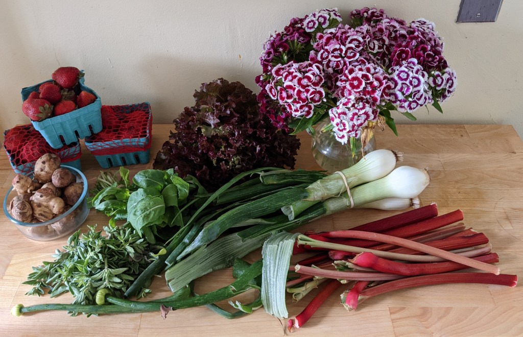The Sweet William is a happy addition to our kitchen. We don’t have a lot of vases, so I put them in one of the (3!) broken pour-over carafes we got at the start of the pandemic. The peonies from the farmers market are still going strong in the heat of our living room, with a few stems still unopened.