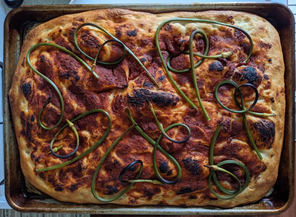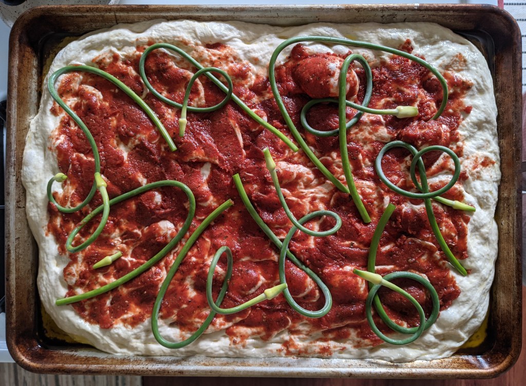For this latest batch, I had some pizza sauce left over from an earlier pizza, so I spread that on top of the dough, and placed the garlic scapes from the latest CSA on top. I probably should have brushed them with olive oil as they blackened a bit, but their flavor is still bright and the added crunch is nice.