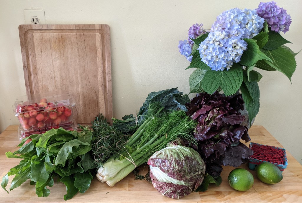We’ve been in the middle of a heatwave in NY, with temperatures in the high 90s combining with a high dew point to create “feels like” temps in the mid-100s. When I got back from the pickup, the hydrangeas were wilting, and so was I. We both drank plenty of water and perked back up, but I didn’t still didn’t feel like making anything last night. Not to complain too much, of course.