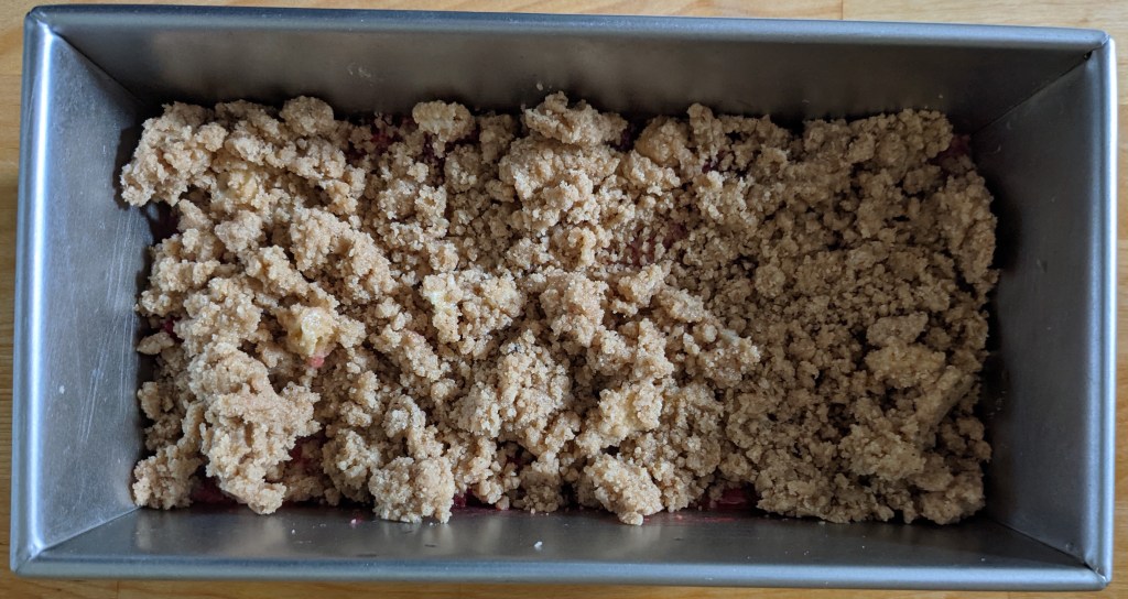 crush berries together with sugar, lemon juice, extracts, and flour. place in fridge for 20–30 minutes until juices begin to extract from the berries. with fingers, mix together crumble topping until it gets…crumbly. uh, butter pan (or don’t, if you’re me and just dumped the berries in there). I used a loaf pan. add berry mixture, and cover with crumble topping. bake at 375 for 40 minutes, or until topping turns golden brown and berry mixture is bubbling (my oven usually takes an extra 10 minutes to bake any sweets, you could probably do it in 30).