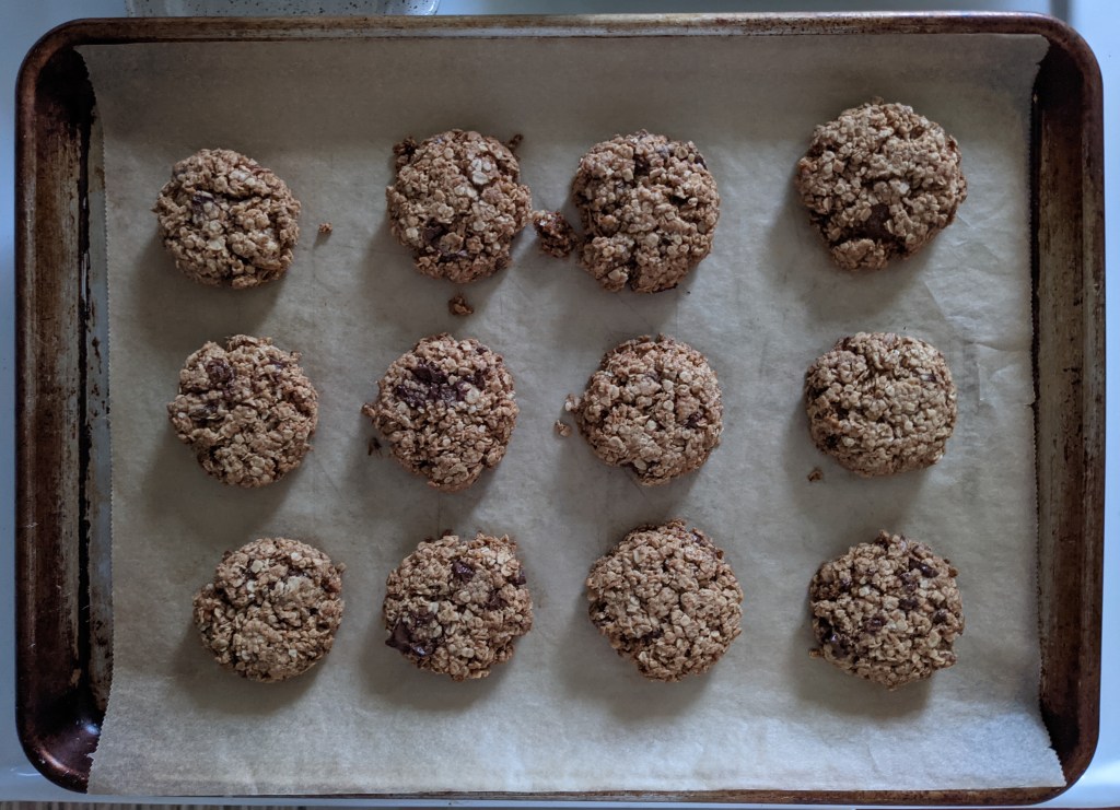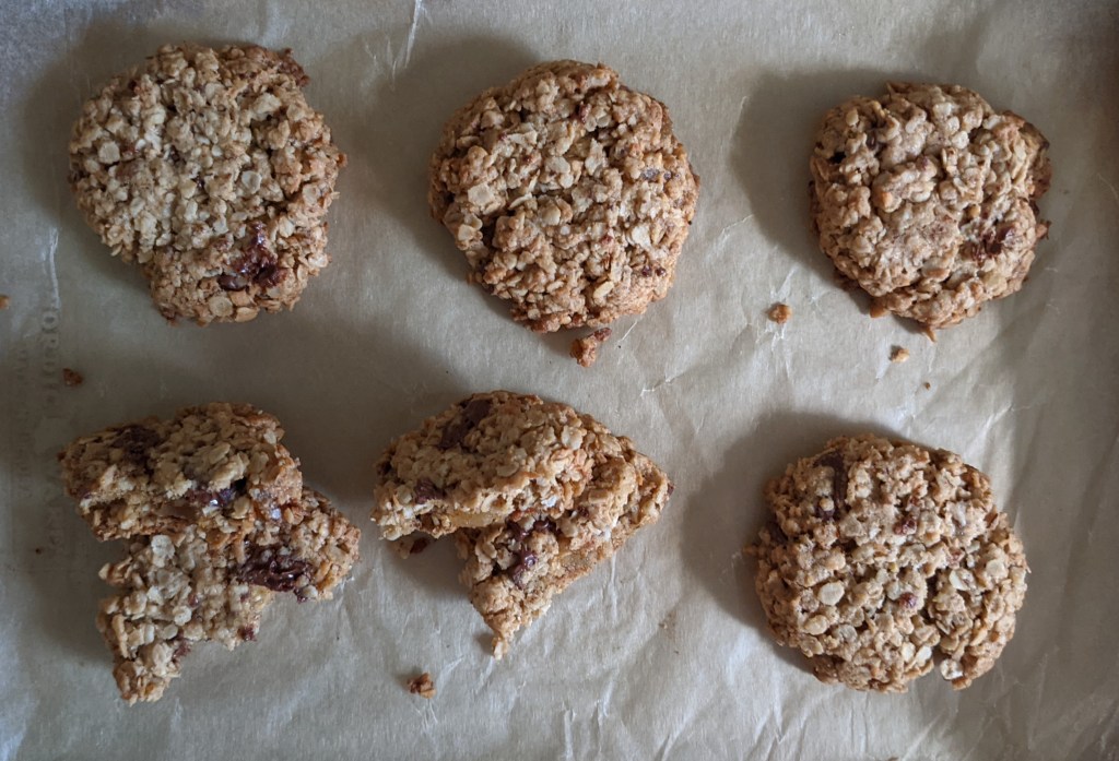 Meanwhile, to satisfy a lingering craving and to use up some lingering ingredients, I made these lying around cookies. Most of a box of instant homestyle oats I’ve had since I started working from home, thinking my morning habits would be the same here as the office (I’m more of a toast or yogurt person now), some candied ginger we got last year for reasons I don’t remember, some shredded coconut from making macarons, chocolate chips for making cookies we haven’t been in the mood for…together make a really good cookie that almost scratches an itch.