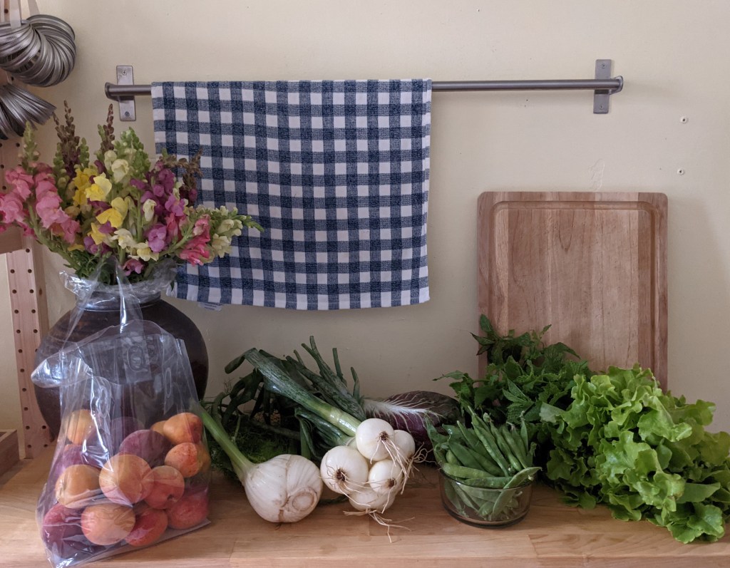 I’ve been sick (why every July?), quashing any plans I had for a weekend filled with canning. Though with the heat, I don’t know if I would have wanted to anyway. I hope things keep in the fridge. J went to the CSA pickup for me, and returned with news that there was no squash this week. I was almost relieved, worried that we wouldn’t be able to cook through the food we already have.