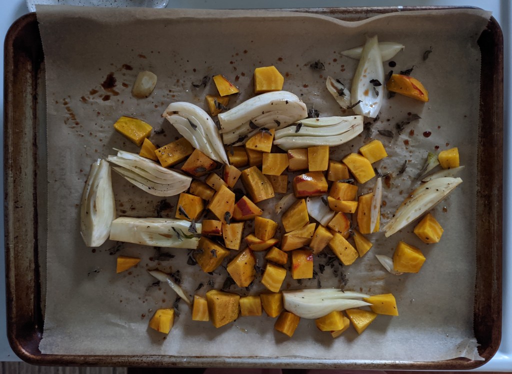 My strength, and somewhat my appetite, came back, so I made a simple dinner of roasted fennel and last week’s beets, with some of the dried oregano I made before. I may have overcooked these, because our power cut out midway through and they were waiting in the oven until it preheated again. But still flavorful.