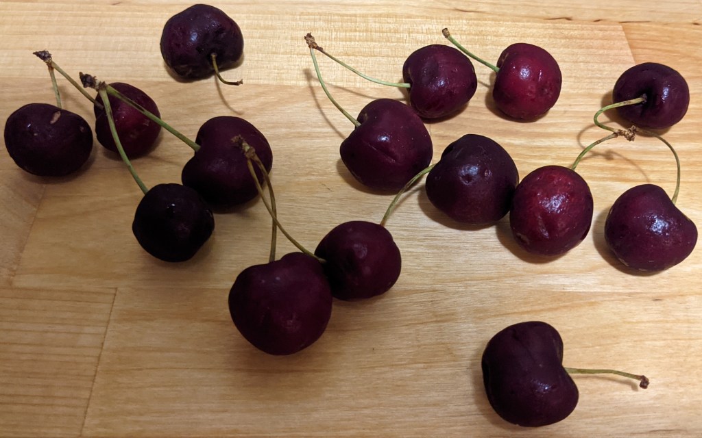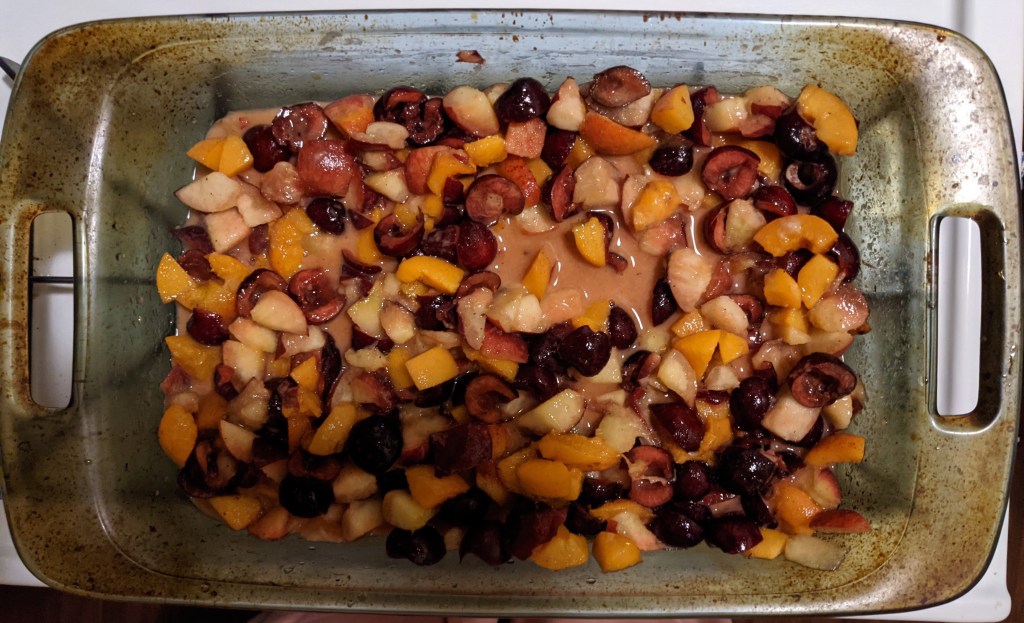 We started making this well after 8, J washed, diced, and pitted, I pulled and mixed ingredients. I pulled the crumble out of the oven by 9:20, and we were eating it by 9:30. It’s incredible! We used a mix of peaches, apricots, and dark red cherries.