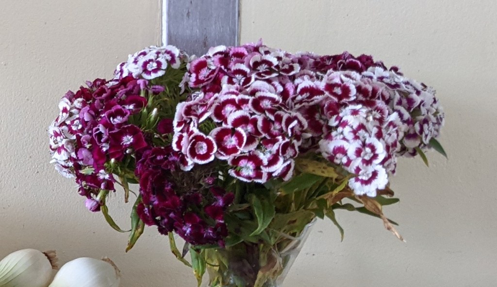 The snapdragons from a couple weeks ago did quite well, and didn’t seem to be affected by the same bug problem the last few bouquets were. The marigolds were refrigerated and became jam, but they weren’t buggy, either. Maybe they’re from a different part of the farm. Maybe the recent heat and humidity have something to do with it.