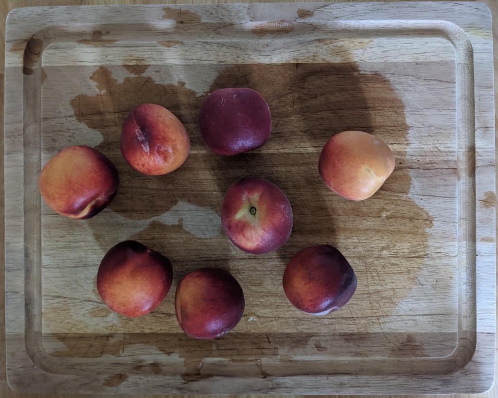 So I made a cobbler with Tuesday’s peaches, using this recipe. I made a few changes to the filling (including omitting the bourbon and adding the rest of our crystalized ginger and the rest of my chai mix for a zestier peach cobbler), skipped the sugar syrup step, and baked it in a 13″x9″ pan—it was incredible, and I think I prefer the biscuit topping without a sugar laminate. It’s fluffy and creamy without being too sweet, a perfect complement to the peaches. My changes below: