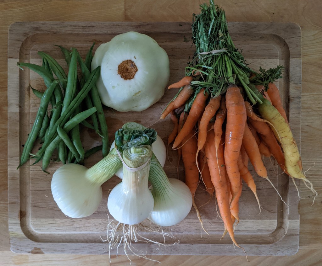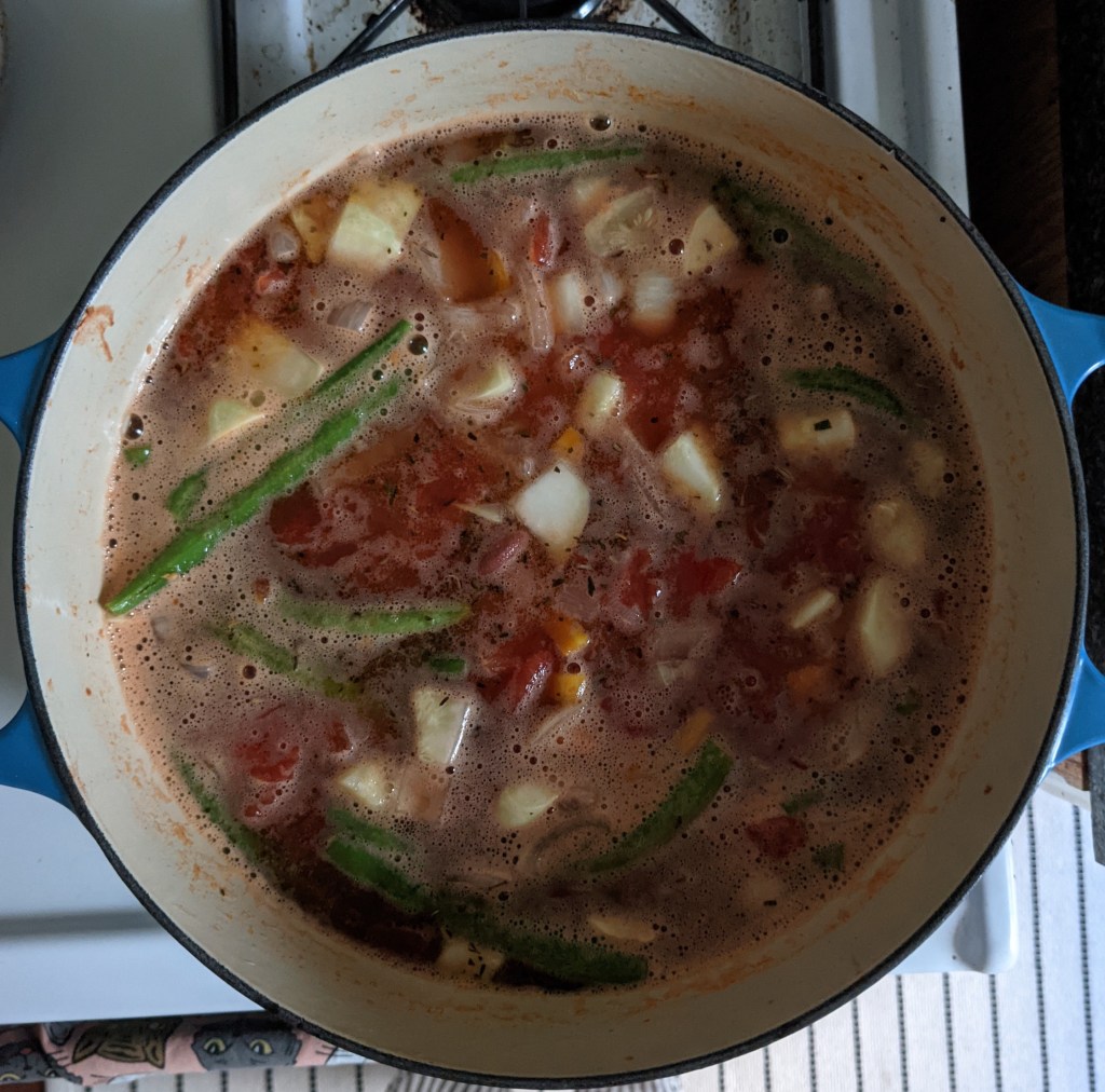 I sauteed the onions and carrots, added the pattypan squash and green beans, as well as a can of kidney beans, a large can of diced tomatoes, and some leftover tomato sauce. I seasoned it with salt, pepper, and herbes, added a few cups of water, and let it boil for about 20 minutes. Delicious.