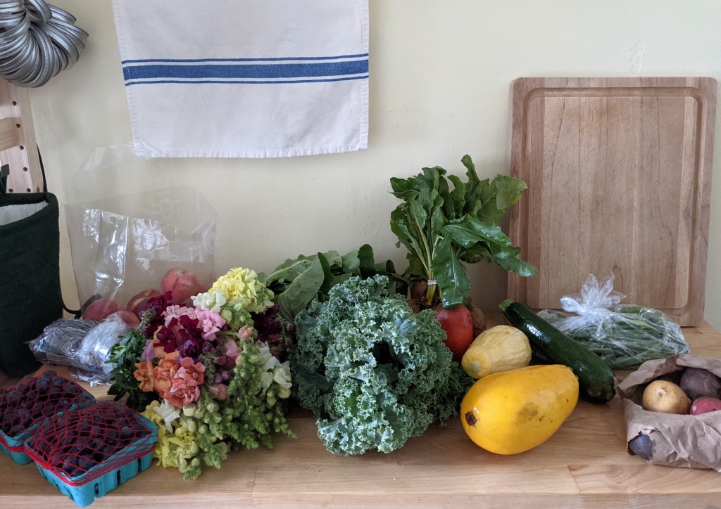 This week the produce was pretty manageable. Plenty of squash, potatoes, beets, lettuce for salad tonight, kale for a caesar later. Peaches for maybe another cobbler? Snapdragons that I hope don’t go to the bugs. It’ll be a great week for fresh and roasted veg.