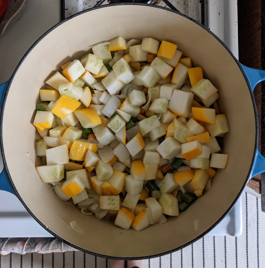 I started with a mirepoix of the carrots, celery, and onions from the past few weeks, and sauteed them for about five minutes with some olive oil. I added diced squash, and let everything simmer for another five-ish minutes.