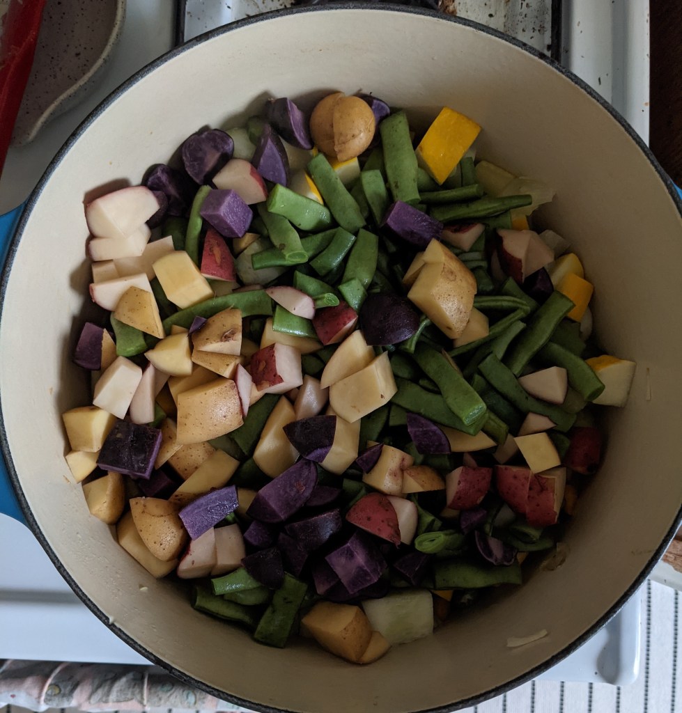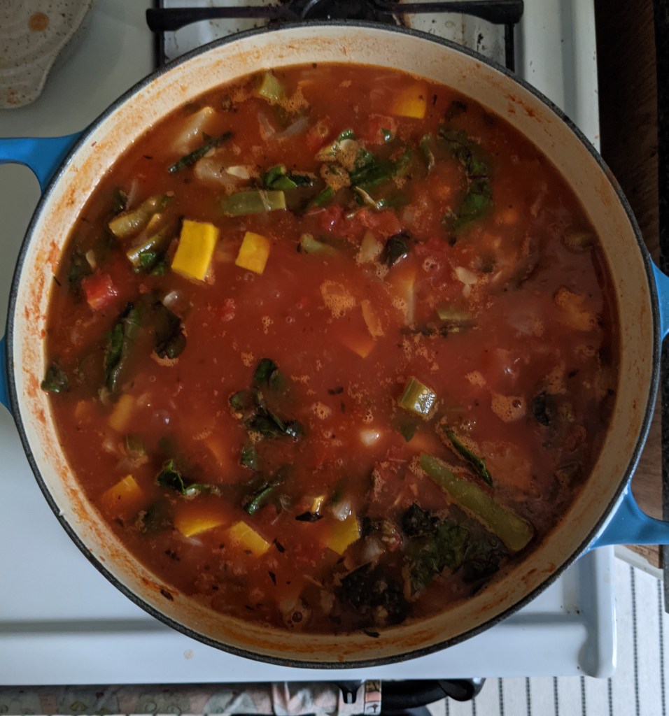 I was able to make an almost-entirely CSA-based soup this week, with everything but cannellini beans and diced tomatoes. I even added my own herb mix that I’ve been building up over the past few weeks of dried oregano, sage, and thyme.