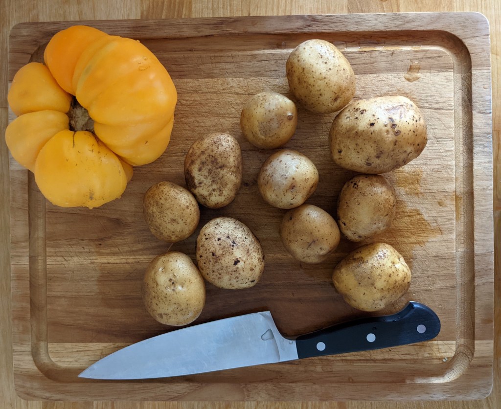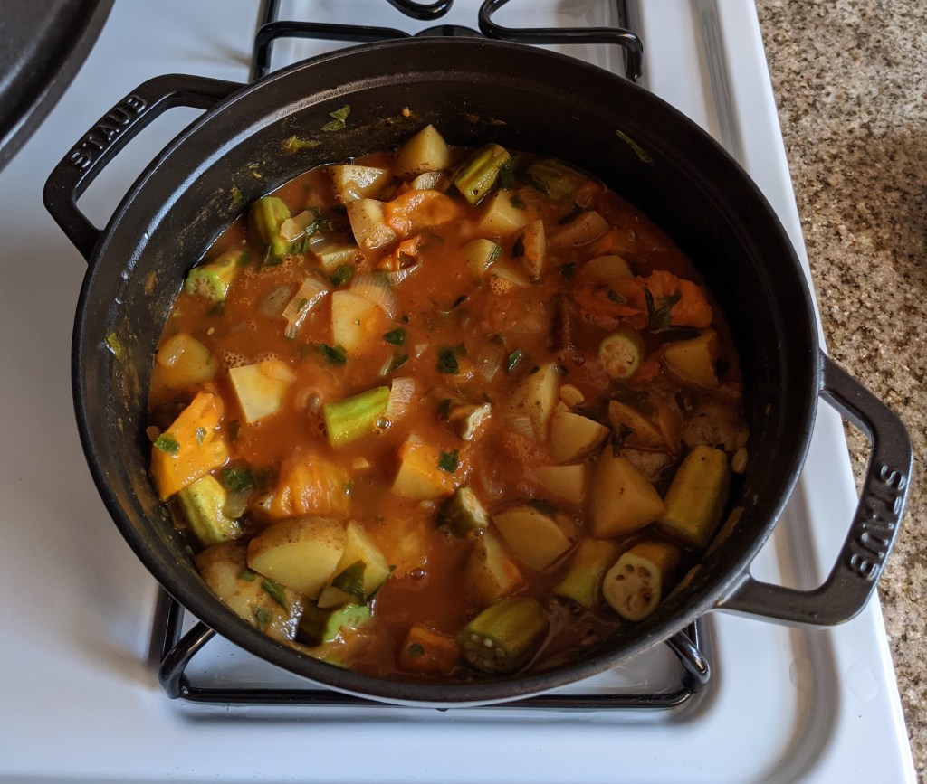 I didn’t follow the recipe exactly, using all of the potatoes (I boiled them for 5 minutes first) and okra, plus one of the giant heirlooms (I left the skin and seeds intact), and most of a bunch of parsley (instead of any cilantro), all from yesterday’s CSA. I used shallots for onions, doubled the garlic, added juice from half a lemon instead of preserved lemon, and omitted the saffron. I also winged it with the spices, and just shook a bunch of each of them into the pot.