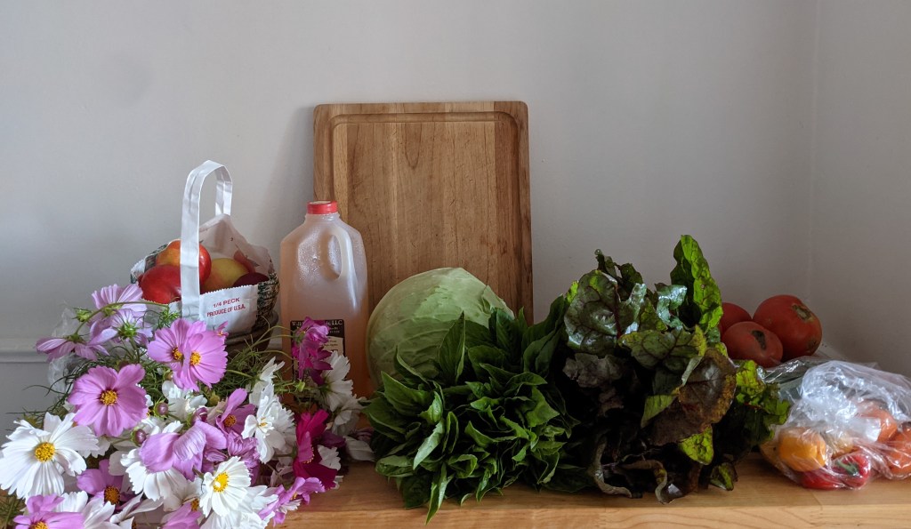 We’re more than halfway through this year’s CSA. After almost 4 months, I’m still surprised by how far a bag of veggies and a bag of fruit can stretch for a 2-person veg household. I’m repeating a lot of meals (more heirloom tomato/bean/basil salad tonight, plus a lentil soup with chard), but I still get to think creatively about meals enough that I’m never bored with it.