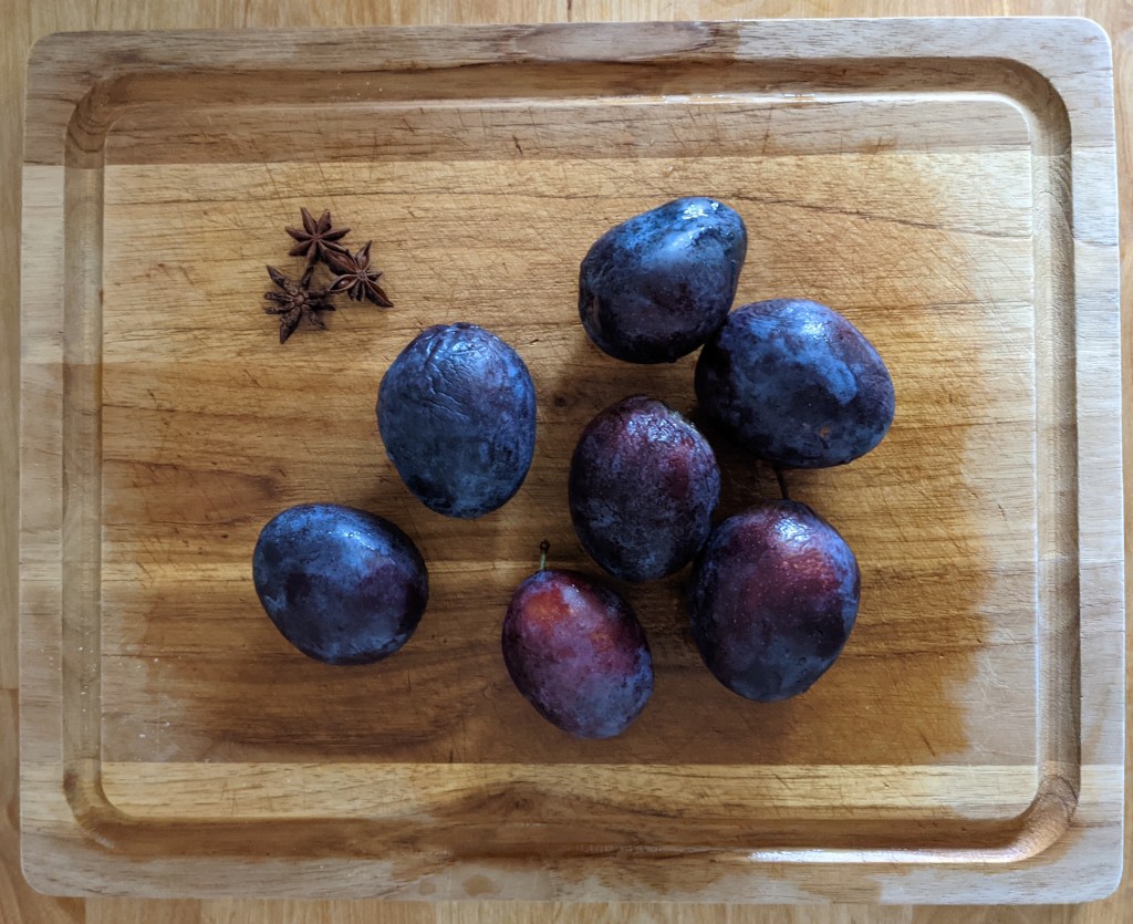 On the first day of fall, I made a wee small batch of Italian plum jam. I’m posting about it today because I couldn’t capture the beautiful maroon color of the jam in artificial light. Even the gray overcast skies that eventually turned to heavy rain couldn’t hide the pinks.