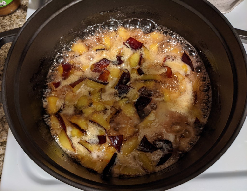 Using the plums from 3 (3!) CSAs ago, I made this recipe. The older fruits were getting brown and shriveled, so I made a giant crumble from the peaches and nectarines, and saved the plums for jam. Seven made exactly 2 1/2 cups, perfect for the recipe above. I let the fruit and sugar sit for about 70 minutes, and boiled it for 10, stirring regularly.