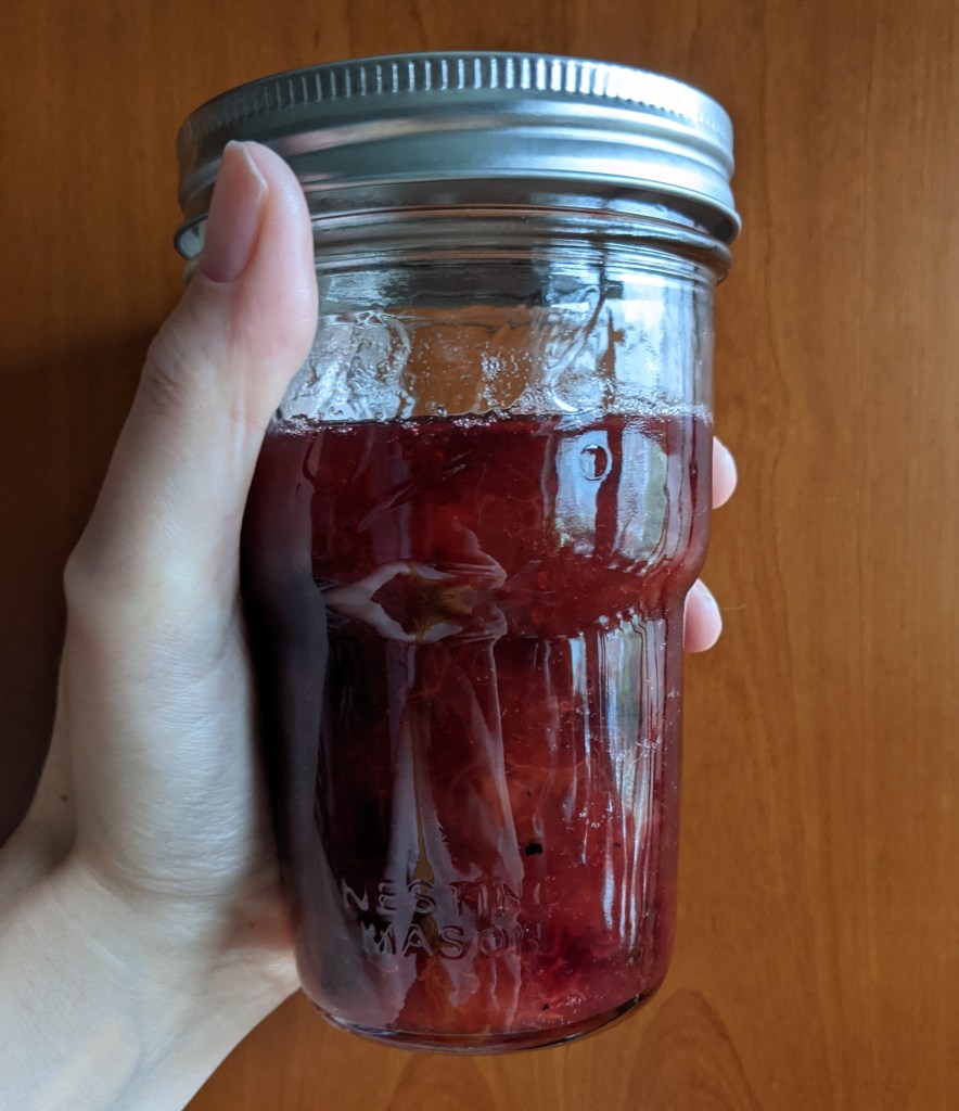 It didn’t quite fill my pint jar, but I wasn’t worried because I refrigerated this batch. It’s so stunning, and perfectly sweet. And completely makes up for the bad jar (too thick, too spiced) of what I think was Italian plum jam from before (mentioned in this post of another good plum jam).