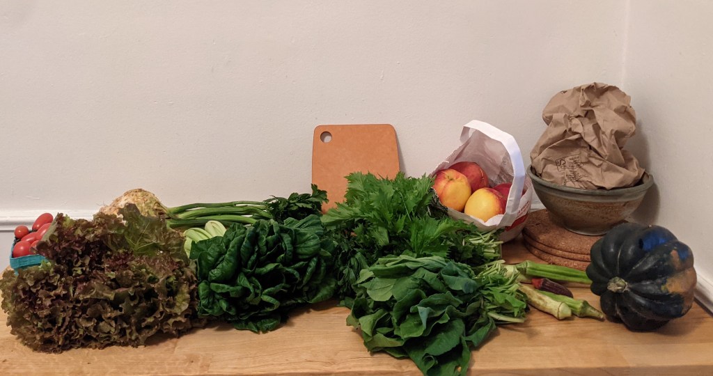 This will be an interesting week, I think. The share is an odd mix of product, not bad, but not a lot that stands out for pairing yet. I made a salad with the lettuce, tomatoes, and the arugula from the herb share, plus carrots and chickpeas. But everything else might be a solo vegetable/fruit to accompany something else. Plus, no cider share this week! Bummer.