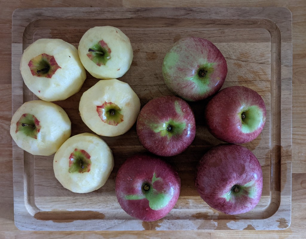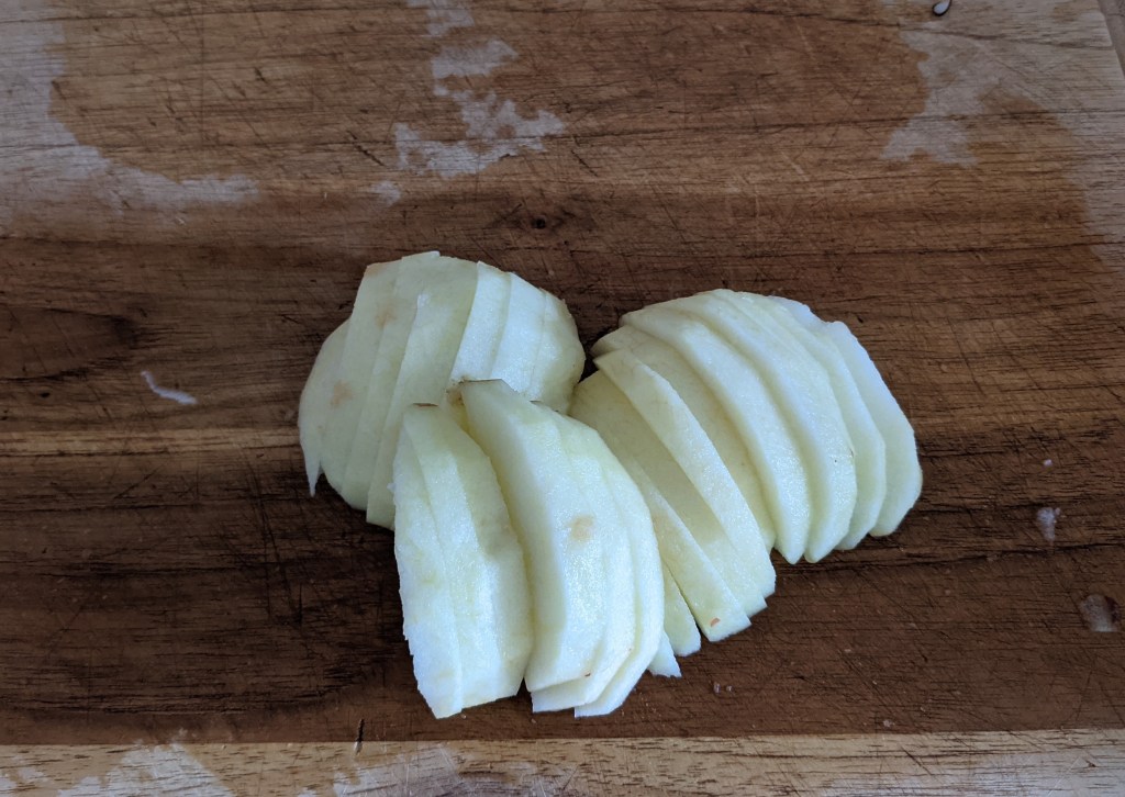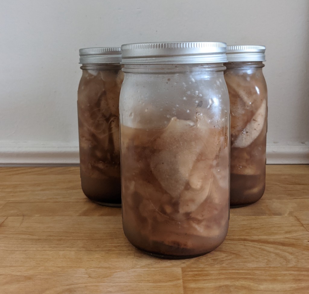 I’m going out of town, and am scrambling to use up anything perishable in the fridge. I thought I could bring the apples for snacking, but I think I’d like to try some local apples rather than add several pounds of unnecessary weight to my carry-on. So, a quick solution I had was to make apple pie filling, and be able to come home to an almost-ready apple pie (just add crust!).