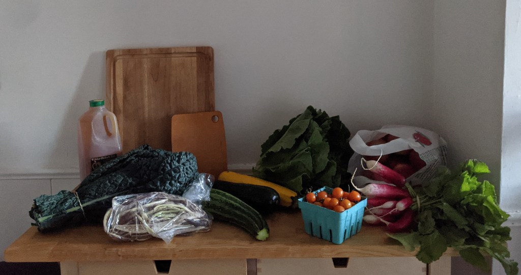I got back from vacation this weekend to real New York fall. Real seasonal gourd hours. I am stoked. There’s still plenty of summer produce in this week’s share, though. There is definitely a salad in there, plus some sort of stewed bean and kale dish. We are fully in soup season now.