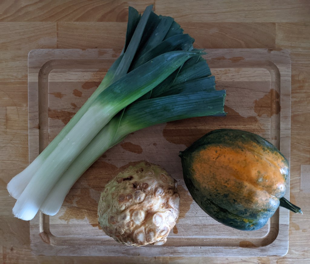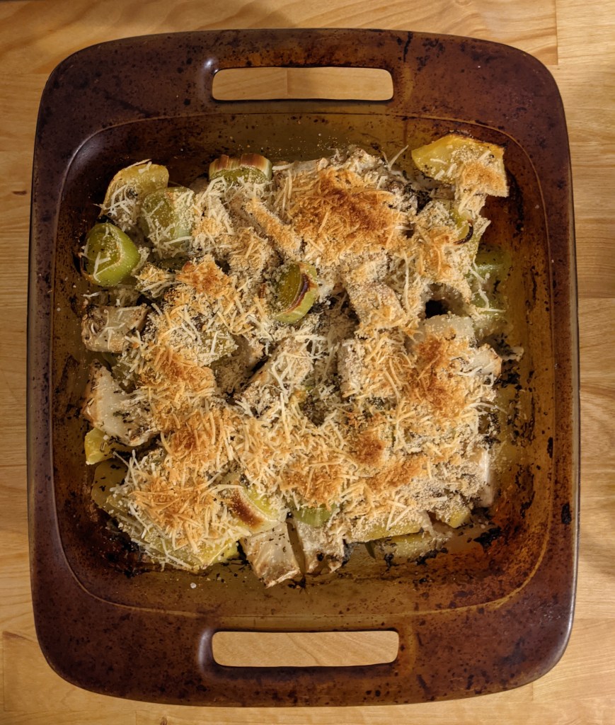 Lucky for me, I found this recipe when searching for what to do with acorn squash and celery root. It’s simple, very simple, and easy to make vegan. I used almond milk instead of cream, and vegan parmesan. (I should probably have used a mozzarella instead; while I have had great success using it in cacio e pepe, it didn’t melt well here.) I really like the way the gratin came out, though. The celery root has a nice kick to it, and the acorn squash adds an autumnal sweetness.
