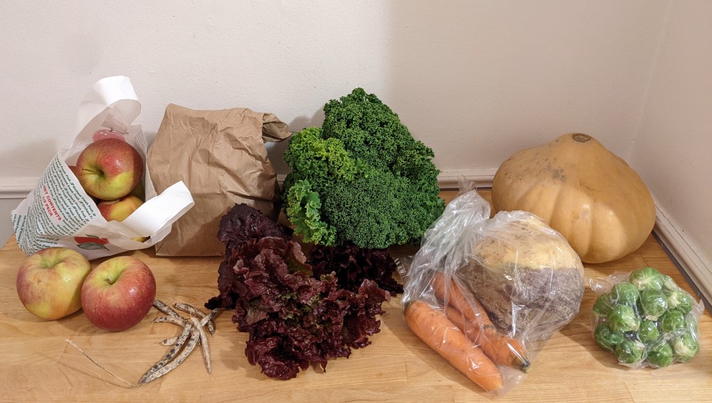 I went to the pickup on an unseasonably warm December evening, during what has been un unseasonably warm December week. There was no one to greet me but the volunteers—a fairly unemotional ending to a months-long event that was maybe more meaningful to me than I have processed yet, but the real party was last week, when the farmer showed up and there was pie.