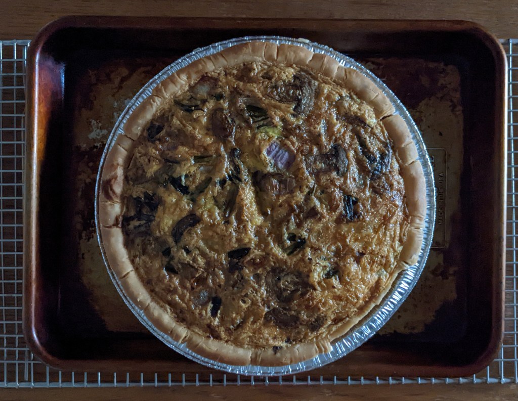 I added 1/4 tsp of nutmeg and 1/8 tsp of paprika to the “egg” bottle, shook it up, and covered the quiche filling with it. I put the quiche in the oven (pre-heated to 375) for about 40 minutes, until the middle was solid to the touch and the quiche turned golden. The taste and texture were perfect. The nutmeg added just the right amount of sweetness to counter the bitterness of the ramps, and the mushrooms added a substance to what would have otherwise been a very light meal.