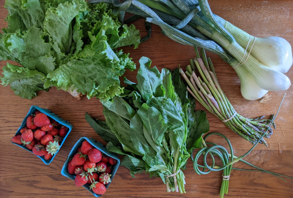 Nice and simple this week. I’m thinking a salad, a side, and a quiche, plus some strawberry snacking for J. Plus the beans from last week which are soaking, and the rhubarb, which I think will become a trusty crumble.