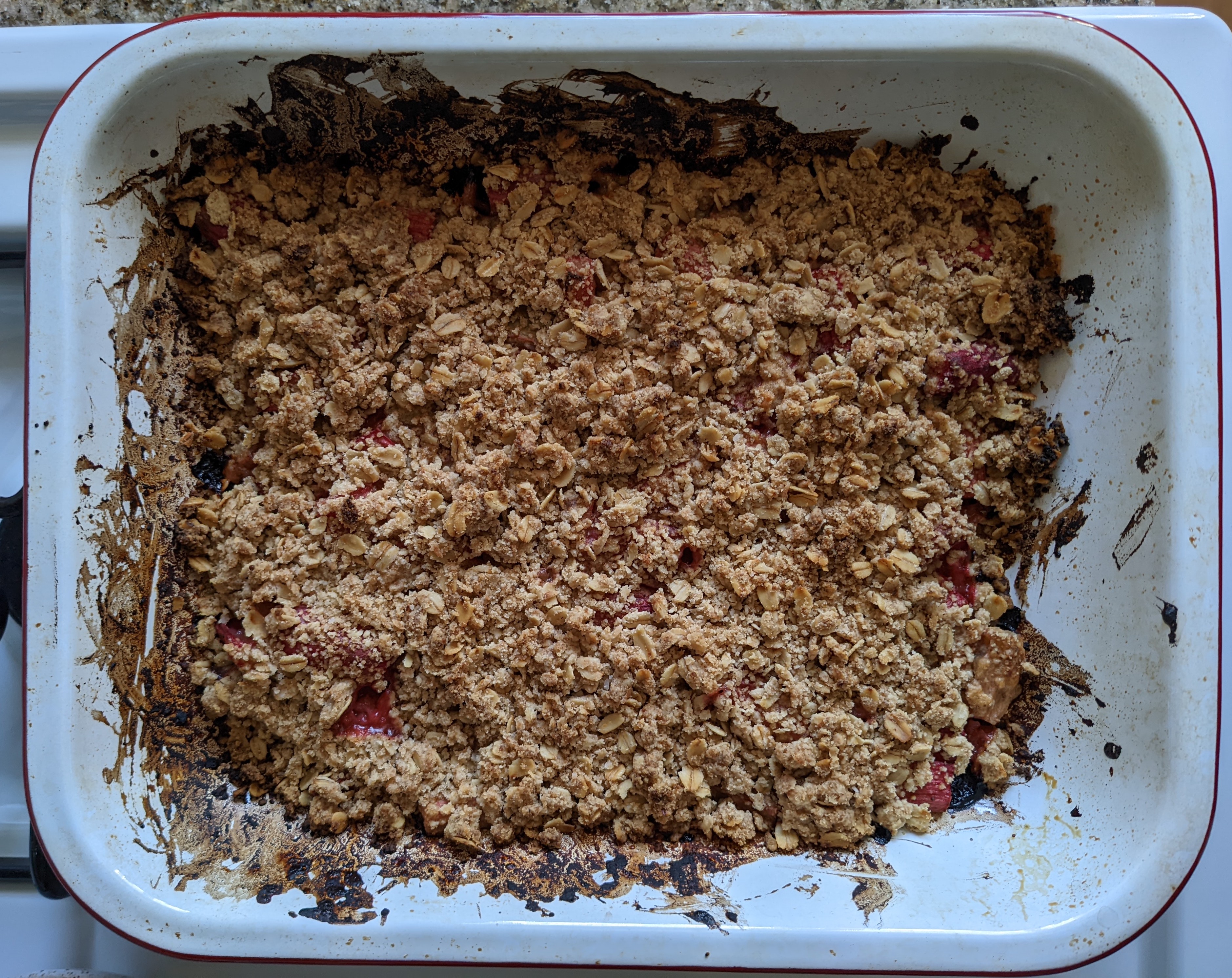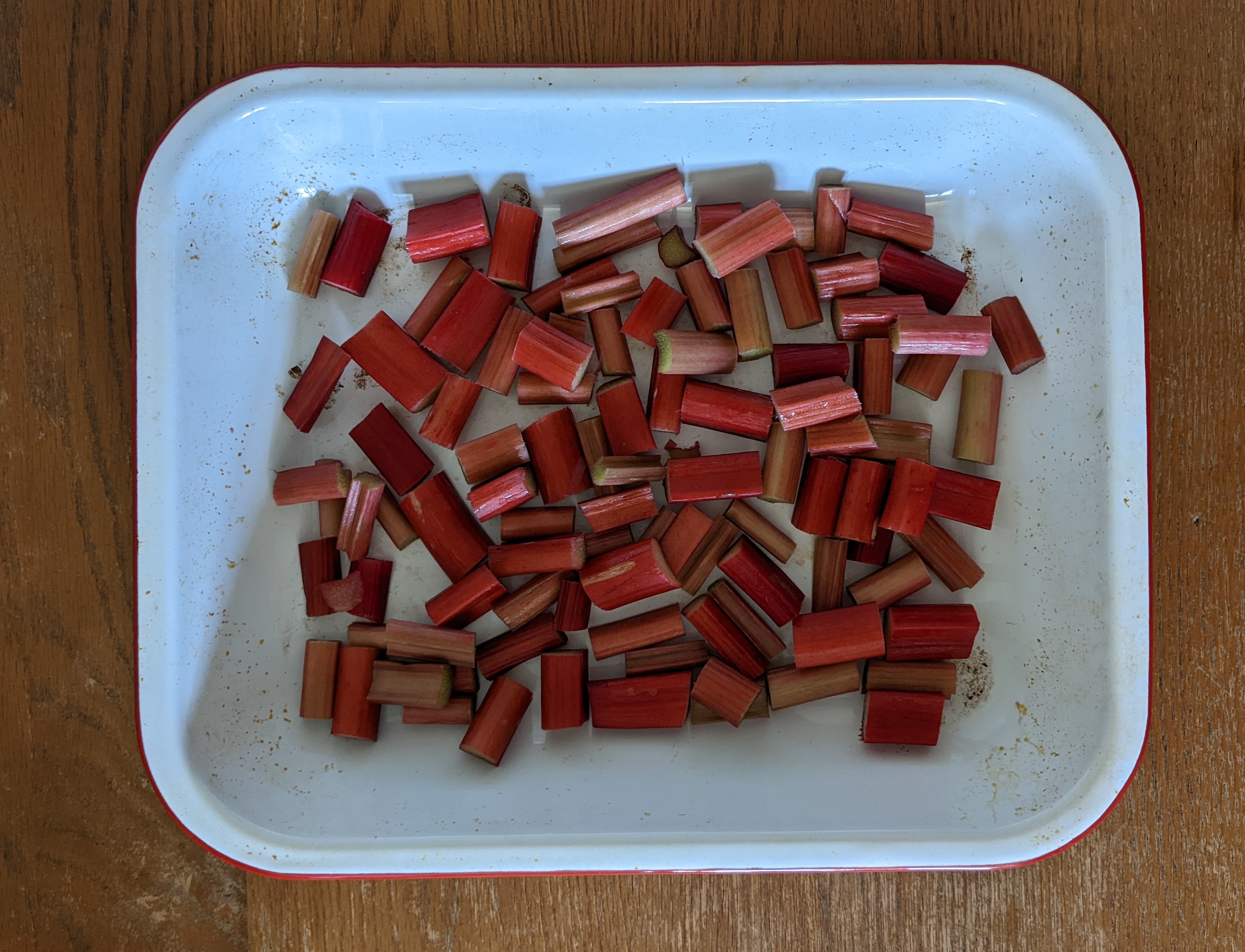 - diced rhubarb, ready for crumble (this recipe halved because I didn’t have blackberries)