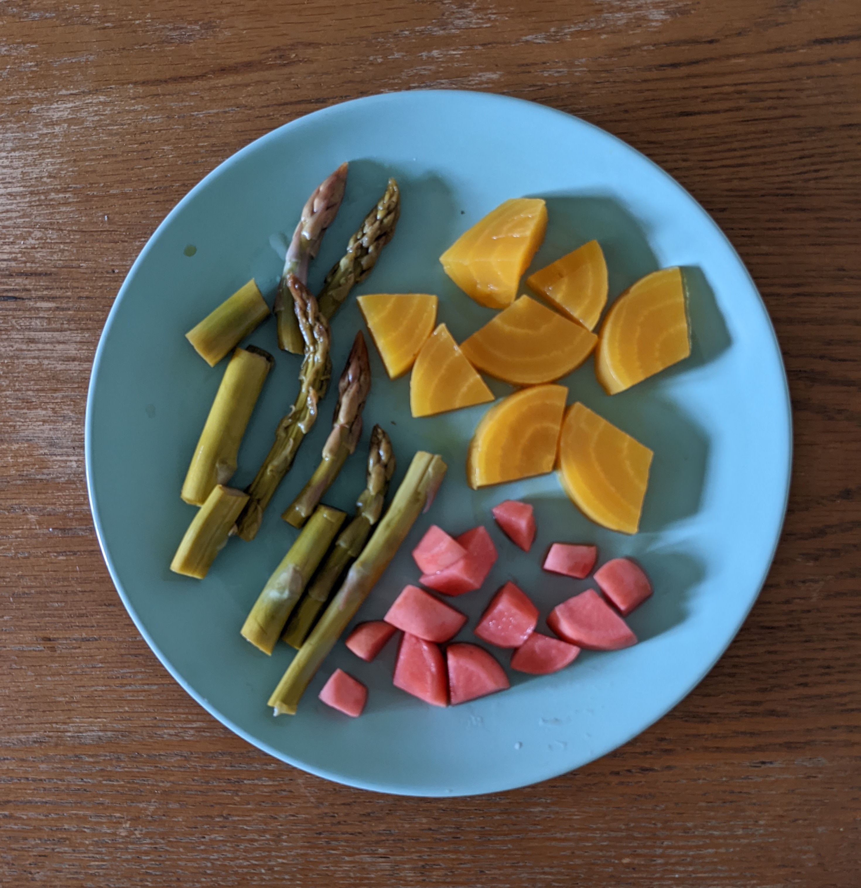 - a snack of last week’s pickled asparagus, beets, and radishes, yum!