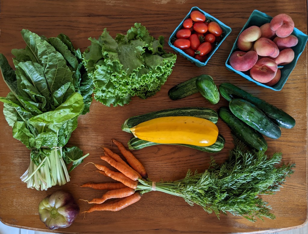We’re in a second heat wave (and the temperatures are only climbing throughout the week), and I trudged down to the CSA for this week’s pickup full of complaints about it. But not for the share! It’s mostly salad fare, which is perfect for not turning on the oven. Not sure about the peaches yet. Maybe a dessert, or maybe just a good snack.