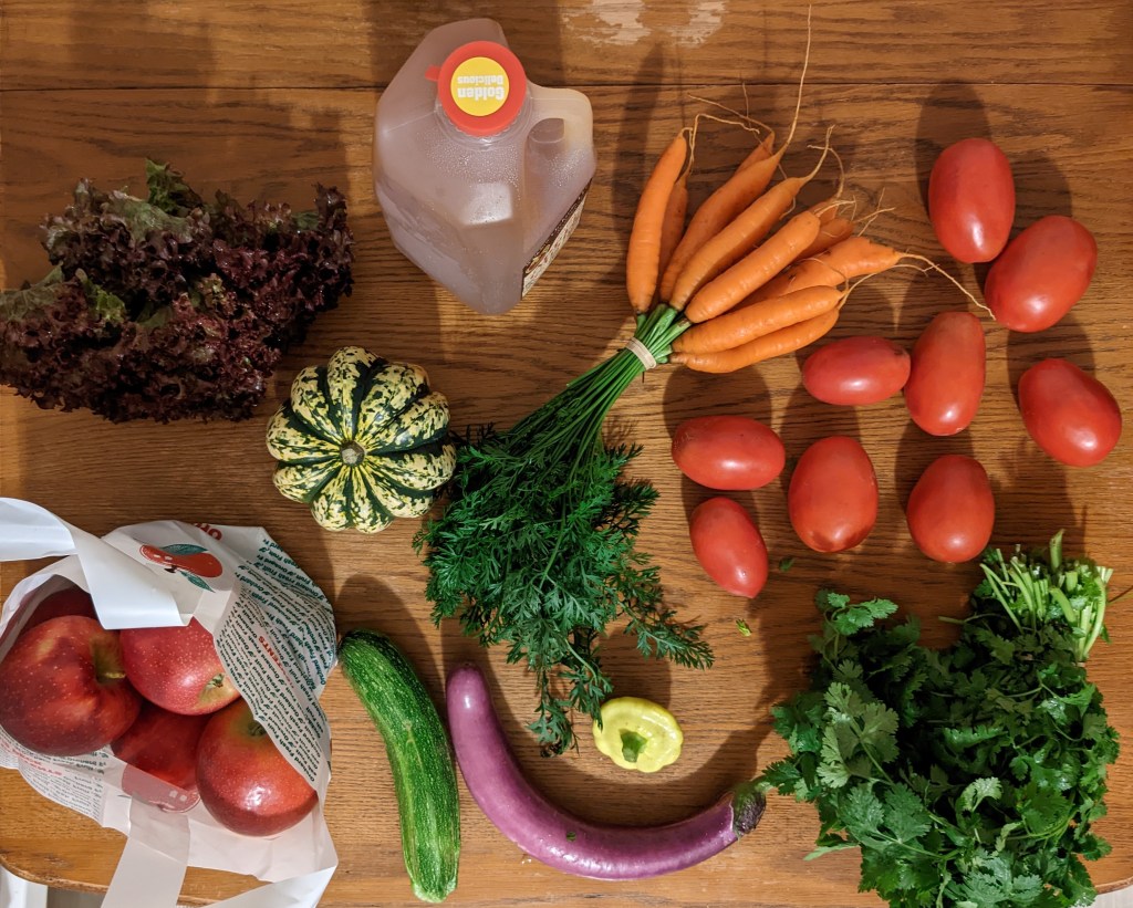 A pleasant week for salad, and probably a salsa. Plus so many apples. I’m sure just for snacking, but maybe there’s a pie in my future?