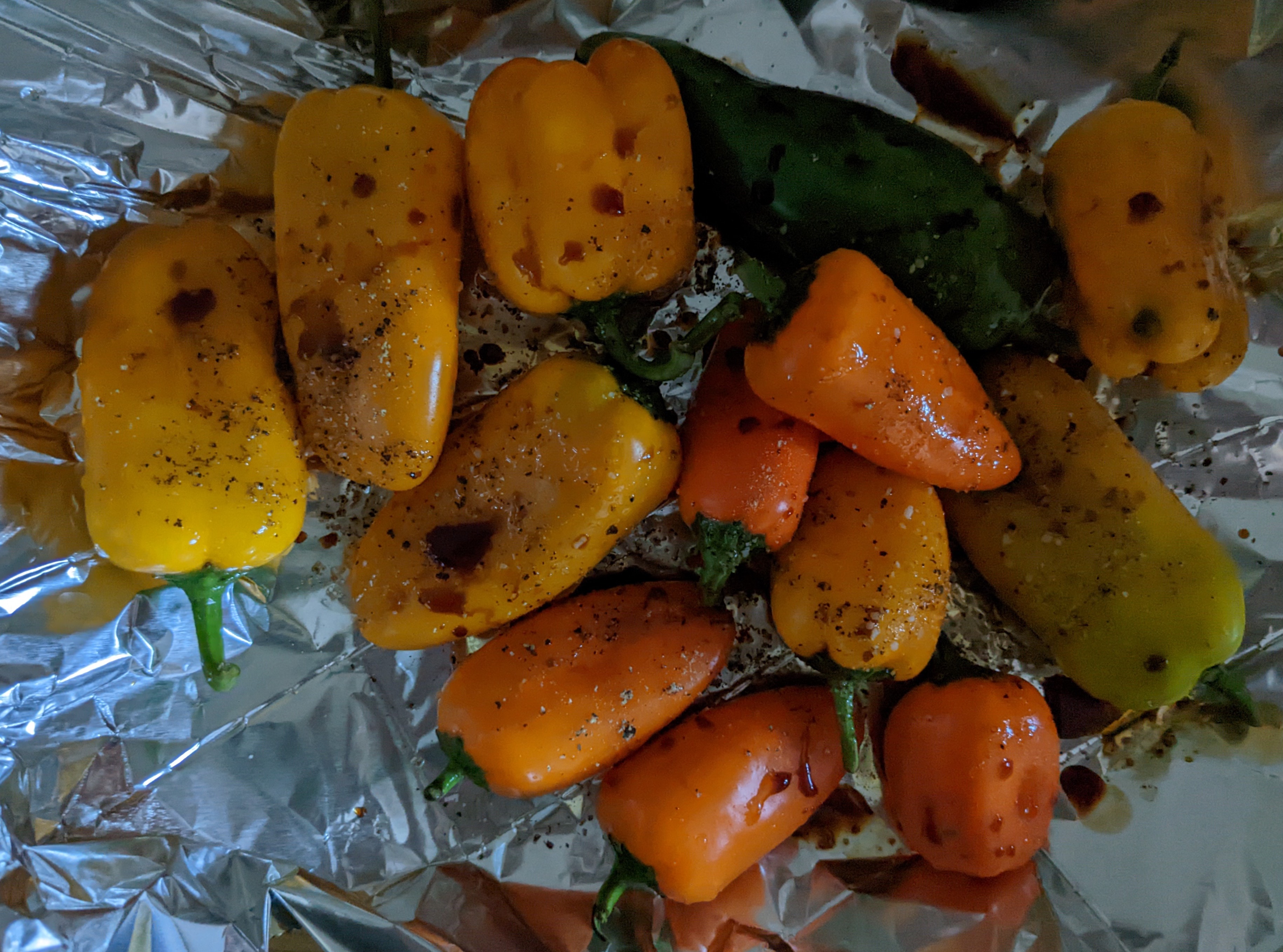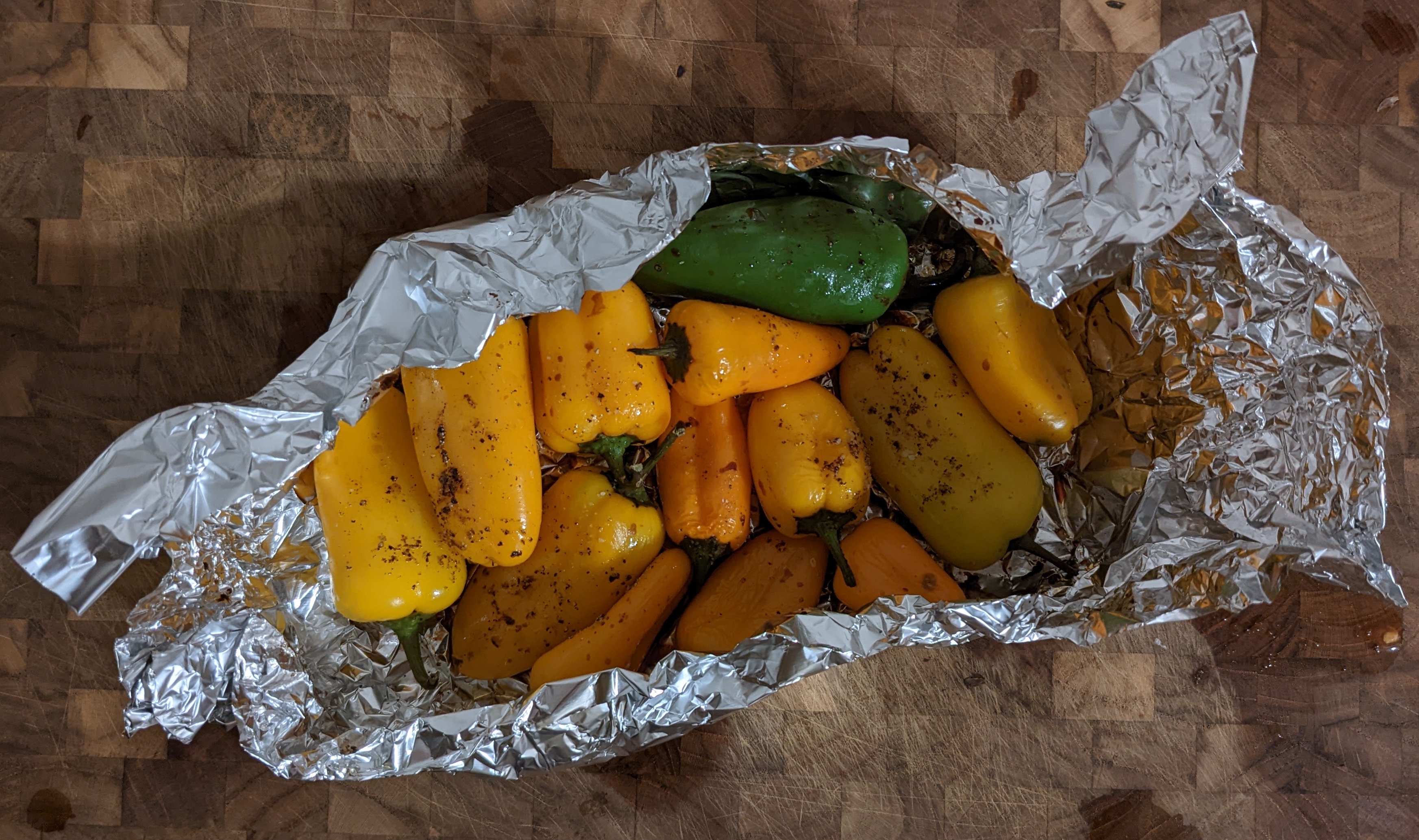 - The peppers wrapped in tin foil, just out of the toaster oven